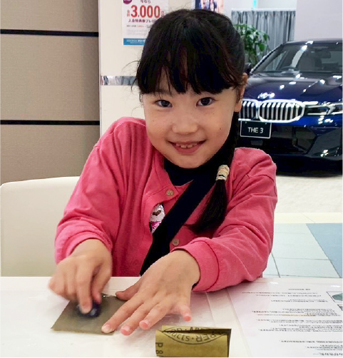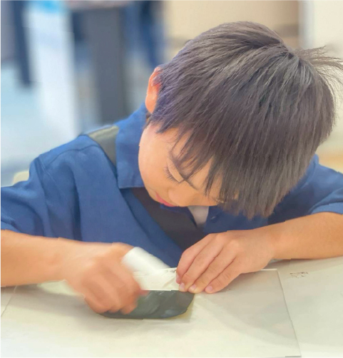 印が付いた平らな面を、紙やすりの上でこするようにみがきます。上からおさえるようにして、前後や円を描くように動かします。水を多めにするとみがきやすくなります。(水が白く変わってきたら、みがけているサインです)