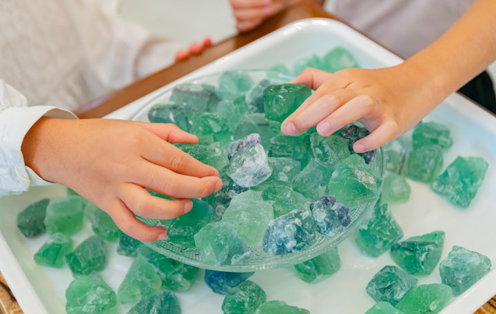 天然石は、ひとつひとつ色や形がちがいます。光にかざすと、色合いや透明感の違いがよく分かります。お気に入りのひとつを見つけよう!