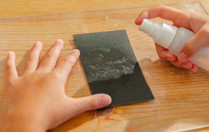 アクリル板の中央に水を吹きかけ、その上に紙やすり(黒#800)をのせます。(やすりが動きづらくなります)そのあと、紙やすり(黒#800)全体に水を吹きかけます。