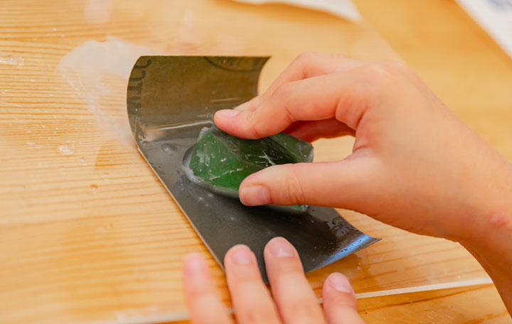 印が付いた平らな面を、紙やすりの上でこするようにみがきます。上からおさえるようにして、前後や円を描くように動かします。水を多めにするとみがきやすくなります。(水が白く変わってきたら、みがけているサインです)